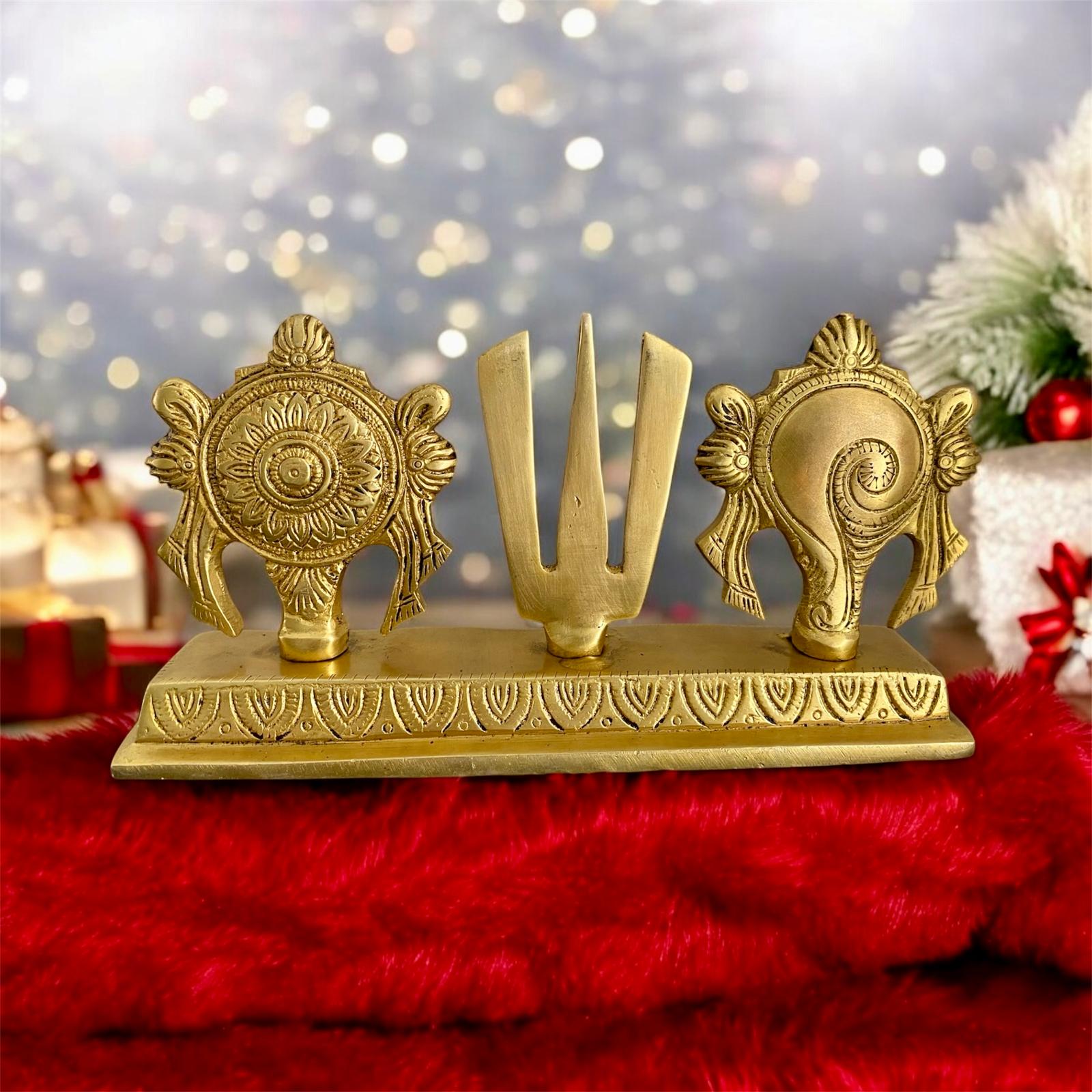 These items are usually crafted from brass, giving them a warm, golden appearance that enhances their beauty. The shankh is typically designed with intricate carvings and details, showcasing traditional artistry. Together, the shankh and chakra serve as powerful symbols in rituals and are often displayed on altars or used in ceremonies to invoke blessings and spiritual energy.