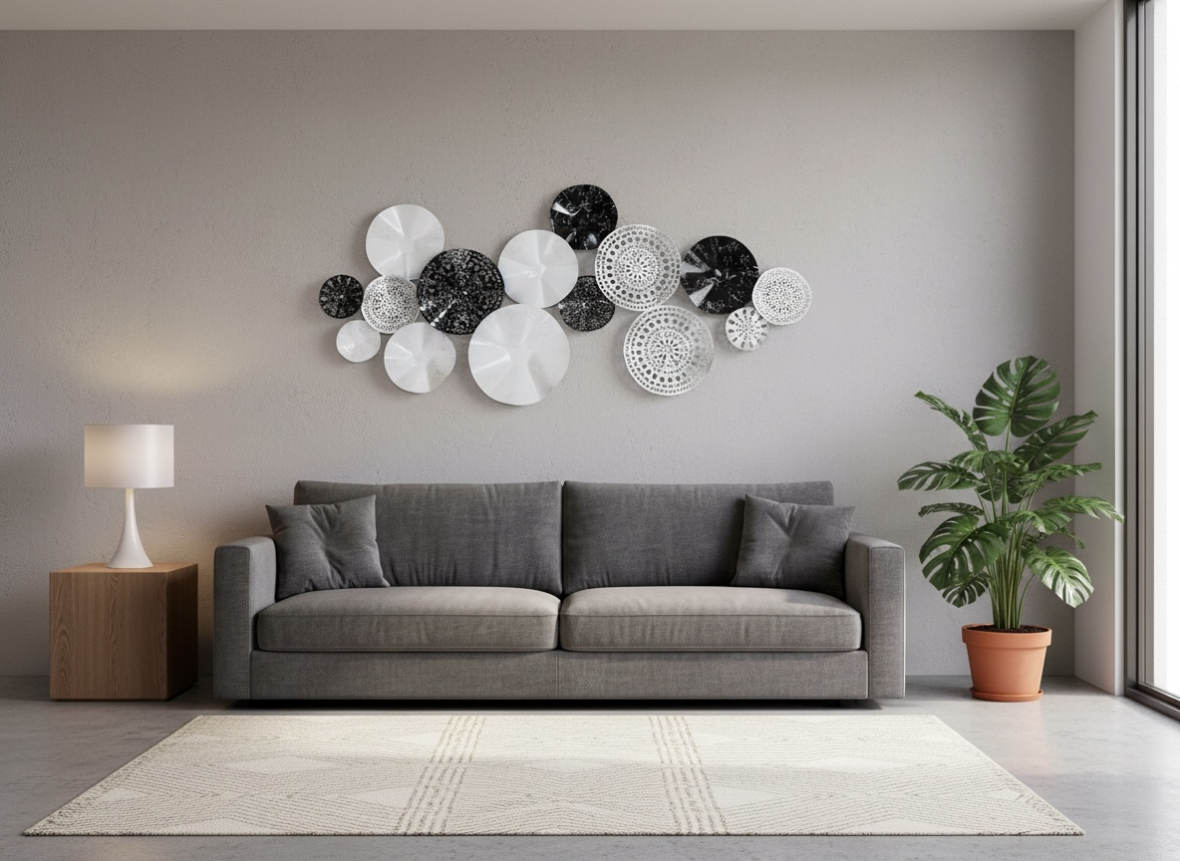 Elevate your Decor with this oversized metal wall art. The Abstract arrangement of black and white circular plates creates a sophisticated balanced aesthetic for any room