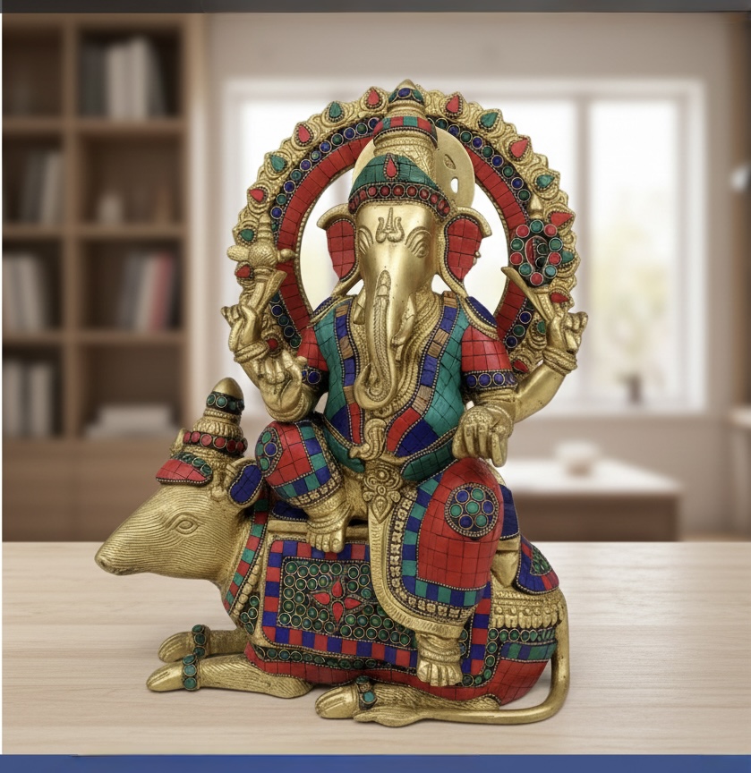 Elevate your space with our exquisite pure brass Ganesha statue, beautifully adorned with intricate stone work. This stunning piece captures the essence of Lord Ganesha, symbolizing wisdom, prosperity, and good fortune. The fine craftsmanship showcases detailed carvings and vibrant stones that add a touch of elegance to any home or office. Perfect for worship or as a decorative accent, this Ganesha statue is a meaningful gift for loved ones or a cherished addition to your own collection. Bring blessings and positivity into your life with this timeless masterpiece.